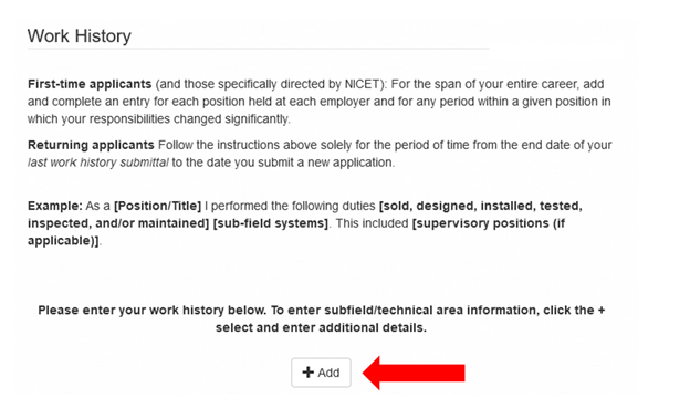 First-time applicants (and those specifically directed by NICET): For the span of your entire career, add and complete an entry (Click “+Add”) for each position held at each employer and for any period within a given position in which your responsibilities changed significantly.