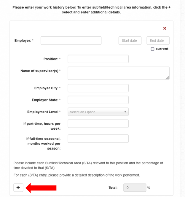 Use the “+” button to break your experience down into all applicable technical areas in which you have worked for each time period. If you have experience in areas that are not listed, use “Other” and explain in the description. Do not add technical areas for which you have not worked.