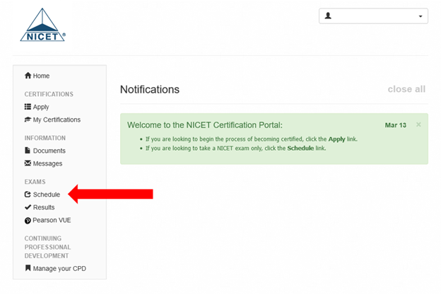 You may also search for an exam another way. Click on “Schedule” on the left side navigation bar on the home screen.